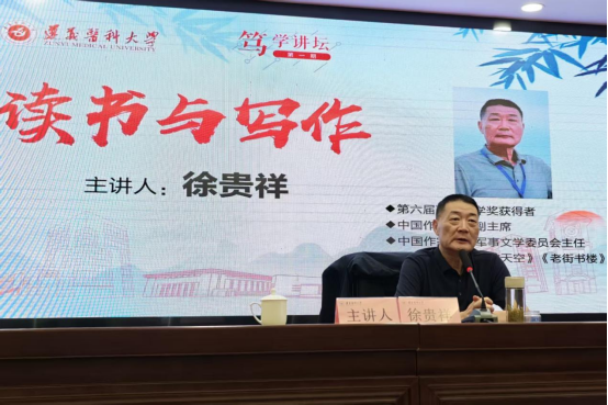 9月26日上午,中国作家协会副主席、中国作家协会军事文学委员会主任、茅盾文学奖获得者徐贵祥先生走进遵义医科大学,在新蒲校区行政楼一楼多功能厅作题为《读书与写作》的专题讲座。学校党委书记刘文,党委委员、副校长陈永正,市文联及作协相关领导、新蒲新区党工委宣传统战部负责人出席,校内师生代表、文学爱好者共同参与。讲座由陈永正主持。