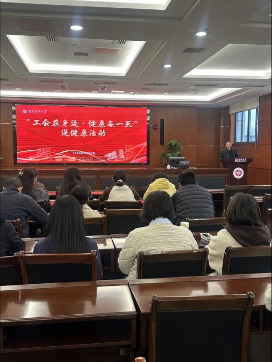 为普及健康知识,提高教职工健康水平,提升教职工幸福感和获得感,10月24日下午,学校工会联合遵义市总工会在行政楼一楼多功能厅开展2025年“工会在身边·健康每一天”送健康活动,学校近百名教职工参加了此次活动。会议由工会主席龙运友主持。